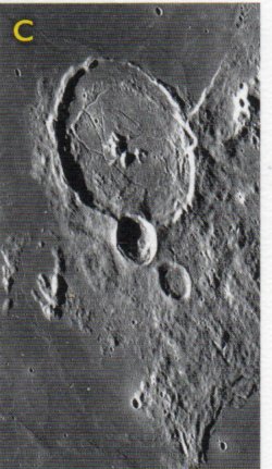 Cratères Théophile (diamètre 101Km), Cyrille (diamétre 98 km), Catherine (diamétre 101 km) : trois cratères en enfilade spectaculaire . Situés au bord de la mer de la Tranquilité, ils servent de repère pour localiser le site d’alunissage d’Apollo 11 (le 20 juillet 1969, avec à son bord Neil Armstrong – le 1er homme à avoir marché sur la Lune, Edwin Buzz Aldrin, le troisième homme Michael Collins étant resté en orbite autour de la Lune).