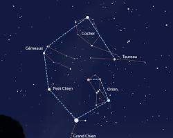 - L’Hexagone d’Hiver : Un immense tracé imaginaire reliant les étoiles les plus brillantes : Sirius (Grand Chien), Procyon, Capella (Cocher), Aldébaran (Taureau), Rigel (Orion) et Castor/Pollux (Gémeaux).