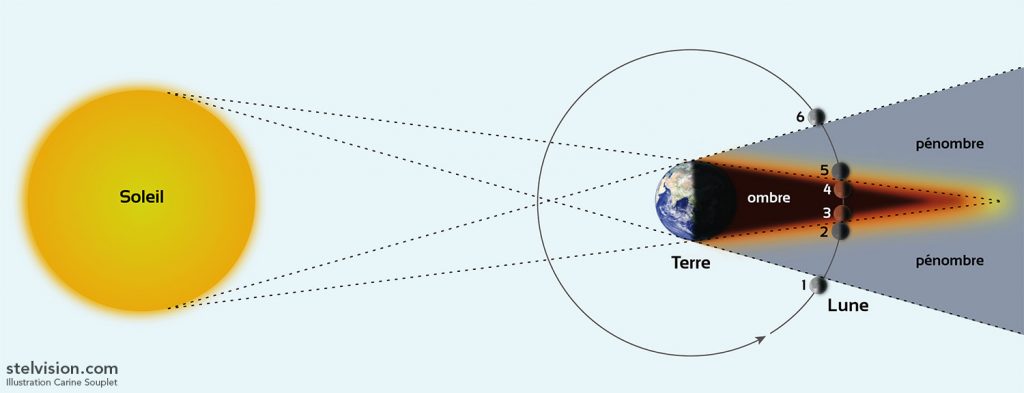 Éclipse lunaire : Elle se produit lorsque la Terre passe entre le Soleil et la Lune, projetant son ombre sur la Lune. Cela ne peut se produire que lors d’une pleine lune. On distingue trois types d’éclipses lunaires :